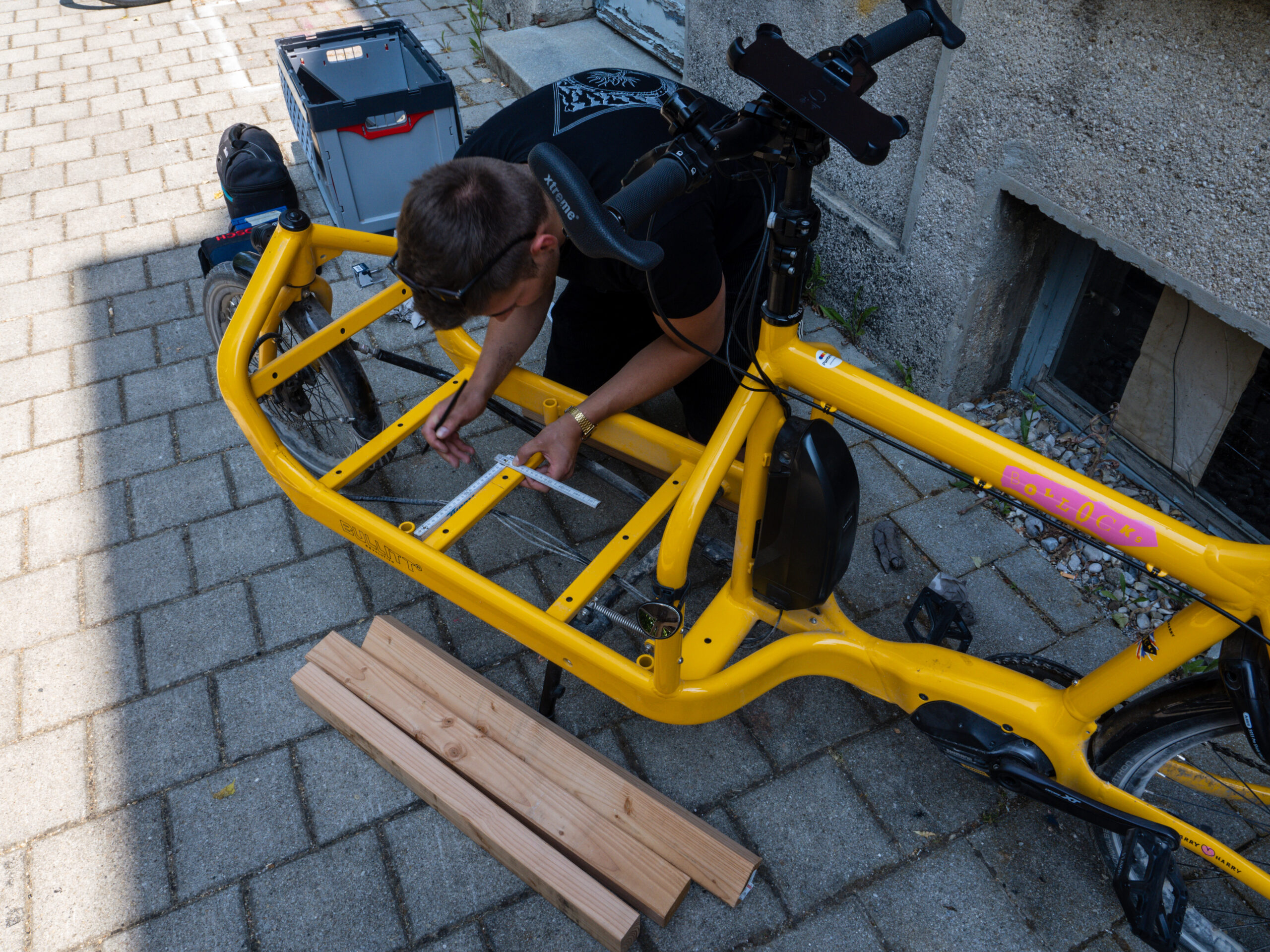 Die technische Basis von CINÉ VÉLO CITÉ ist ein eigens entwickeltes, modular aufgebautes Lastenrad. Es handelt sich um einen Prototyp, der über einen Zeitraum von zwei Jahren kontinuierlich entwickelt, getestet und angepasst wurde. Ausgangspunkt war nicht ein fertiges Produkt, sondern ein offener Entwurfsprozess, orientiert an realen Einsätzen im Stadtrau